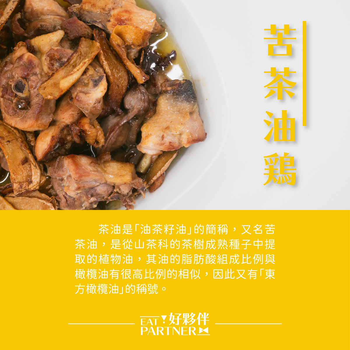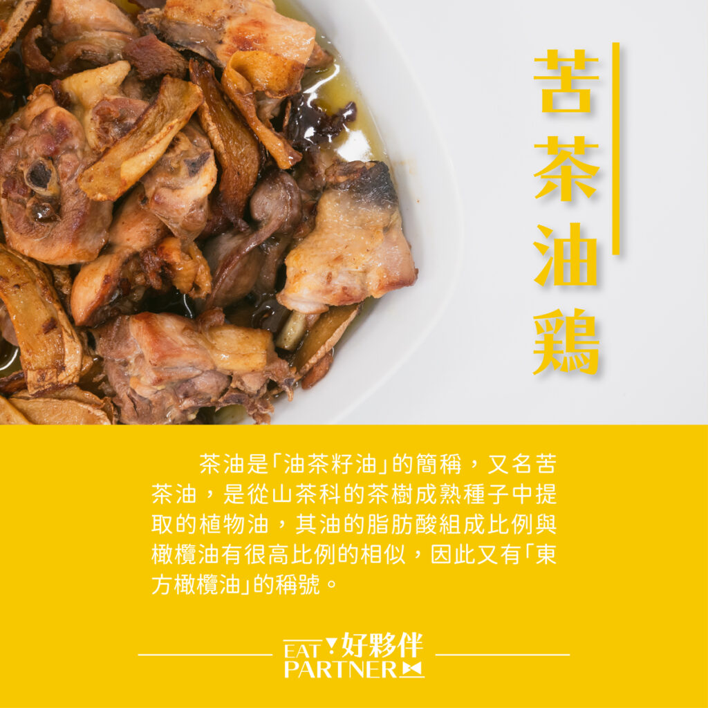 茶油在中國的飲食紀錄超過千年,是華人喜愛的高級食用油,且茶油的發煙點高逾200°C,相當適合使用在中式料理中操作。而且在中醫系統中,苦茶油消炎、開脾又健胃,與橄欖油一樣含有許多的多酚類成分,能消炎又抑菌,實在是居家料理、宴會辦桌,必備好油呀!