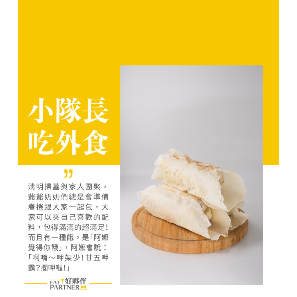 清明掃墓與家人團聚,爺爺奶奶們總是會準備春捲跟大家一起包,大家可以夾自己喜歡的配料,包得滿滿的超滿足!而且有一種餓,是「阿嬤覺得你餓」,阿嬤會說:「啊唷~呷架少!甘五呷霸?擱呷啦!」