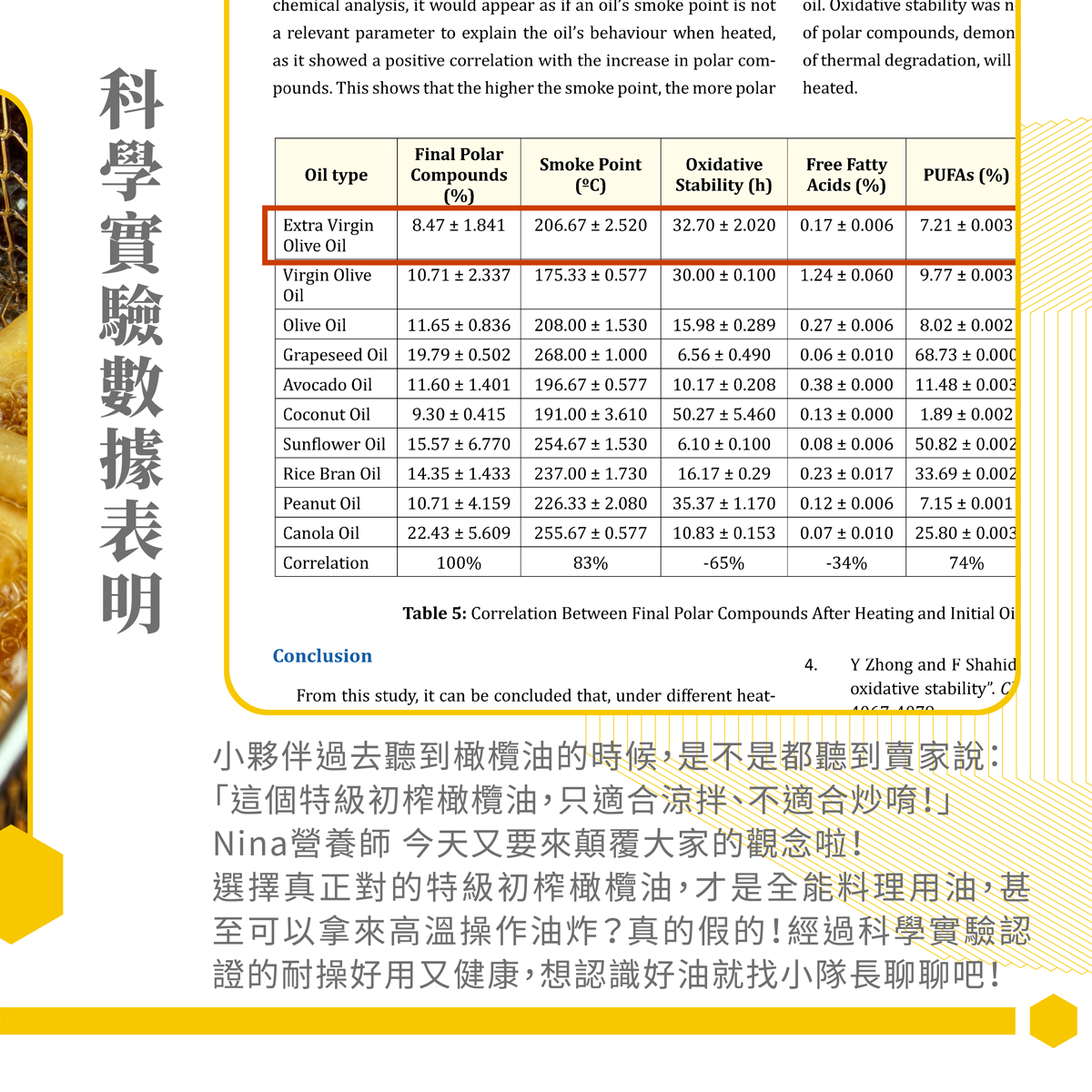 一份2018年的研究期刊顯示,特級初榨橄欖油在溫度操作中,雖然其發煙點為206.67℃,不算所有品項中最高的,但其最終生成的極性化合物之%是最低的,顧名思義也就是最耐操的!請參見如下表所示: