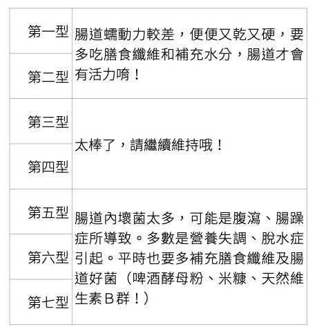 正常的糞便應是腸狀,表面有裂痕、或是長條狀,光滑而柔嫩。根據布里斯托大便分類法,主要分成7型: