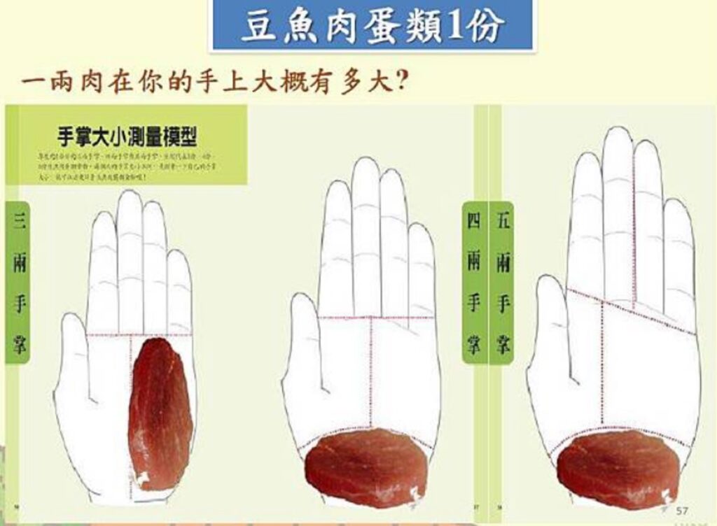 - 魚蛋肉一掌心:蛋白質食物一掌心約可提供豆魚蛋肉類1.5至2份,為避免同時吃入過量不利健康的飽和脂肪,選擇優先順序依序為豆類> 魚類與海鮮> 蛋類 >禽肉、畜肉,並盡量避免加工肉品。